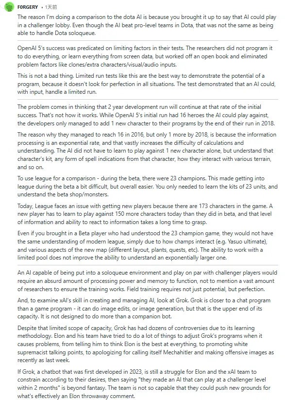 更不用说最明显的因素了。我们说的可是埃隆·马斯克,一个在东西发布前恨不得吹爆所有细节的人。你觉得如果他真的做出了一个能血虐韩服单排天梯的AI,他的自负会允许他保持沉默吗?