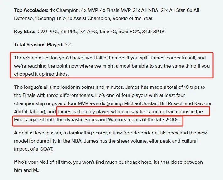 BR在撰文中也给出了老詹排第二的解释